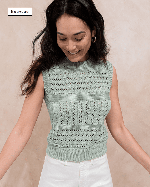 Idéal pour la saison estivale, ce pull sans manches Léandre se tricote en Phil Coton 3 avec un superbe mélange de points ajourés.